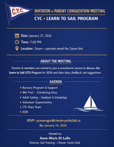 We hope you and your young sailors are doing well. As we prepare for the upcoming 2026 season, we would like to invite you to a Consultation Meeting to discuss and provide input on the CYC Sail Training Program.